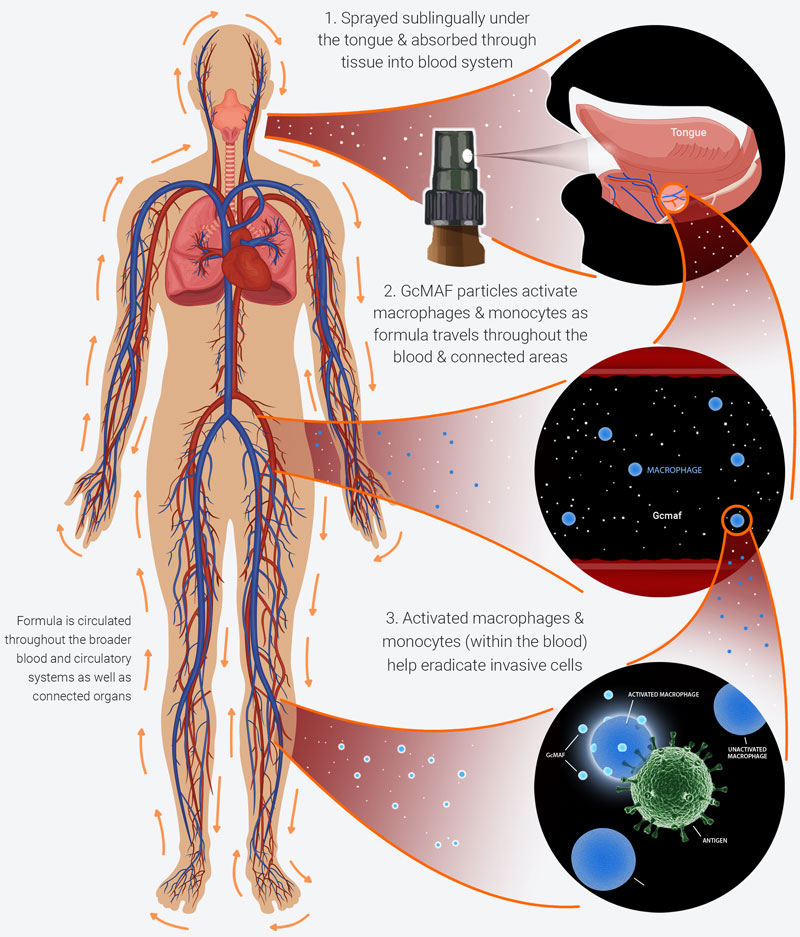 Для использования просто распыляйте под спинку языка два раза в день. Жидкая формула предназначена для всасывания в капилляры под тонкими слоями тканей языка и распределения по более широким системам крови и кровообращения. Это очень эффективный способ для GcMAF активировать моноциты (макрофаги в крови), а также те, которые расположены в связанных тканях/органах, в фагоцитарное состояние. Спрей не предназначен для переваривания. Мы рекомендуем не есть за 15 минут до и после использования, чтобы не прикрепиться к пищевым/жидким частицам и не перевариться. Если GcMAF переваривается, желудочные кислоты разрушают его, что делает его бесполезным. Вот почему мы НЕ рекомендуем использовать любой тип переваренного продукта GcMAF, включая таблетки, леденцы или йогурты, независимо от того, что производитель говорит о кишечнорастворимых покрытиях или тому подобном.